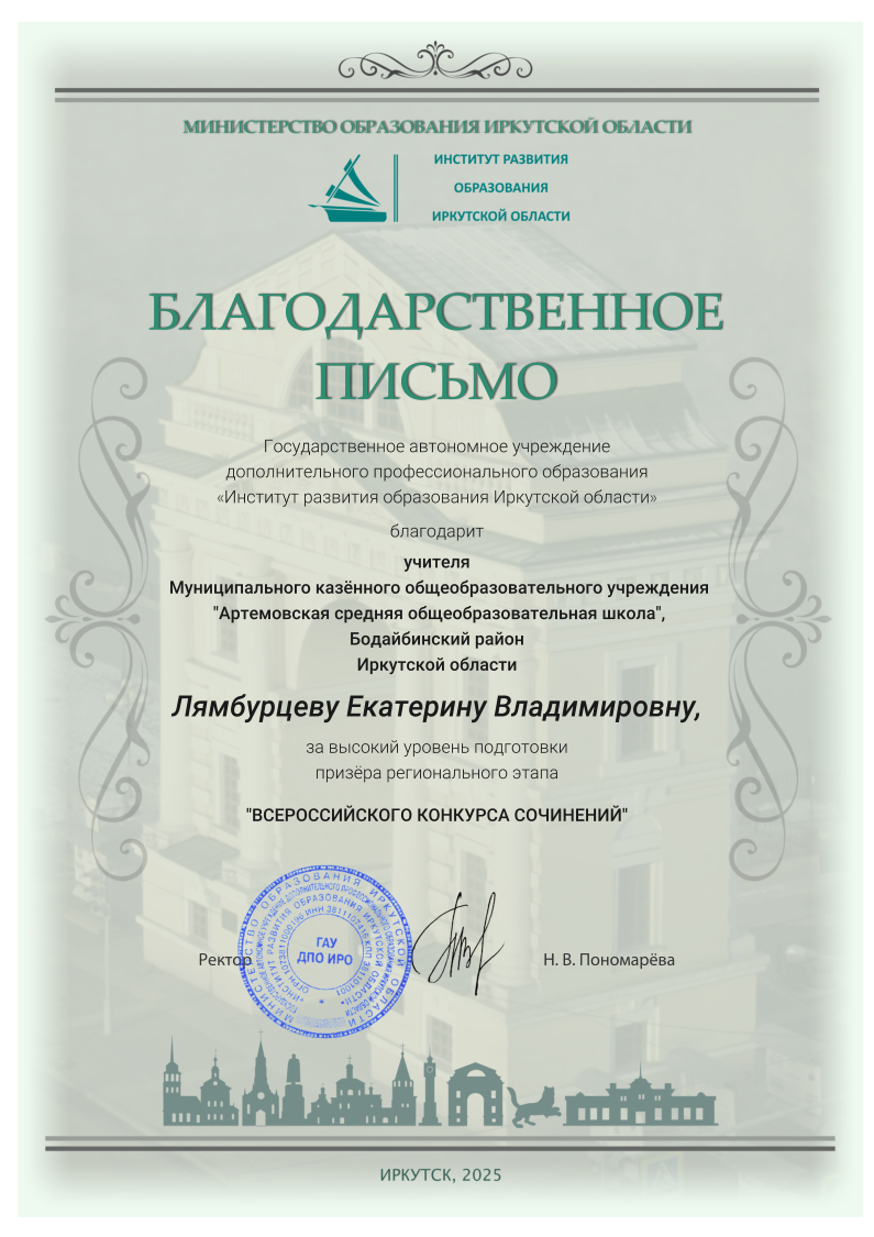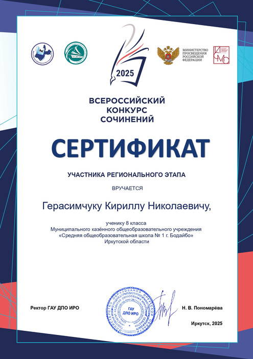 С 27 июня по 12 сентября 2025 года в Бодайбинском районе проходил муниципальный этап Всероссийского конкурса сочинений-2025. Цель мероприятия – повышение читательской активности, формирование положительного отношения к русскому языку и литературе как важнейшим духовным ценностям, популяризация грамотного владения языком среди молодёжи и знания художественной литературы.