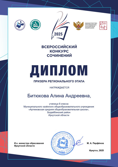 По итогам регионального этапа высокие результаты показала ученица 6 класса МКОУ «Артёмовская СОШ» Алина Битюкова, став призером в своей возрастной категории (3 место). Её руководителем является учитель русского языка и литературы Екатерина Владимировна Лямбурцева.